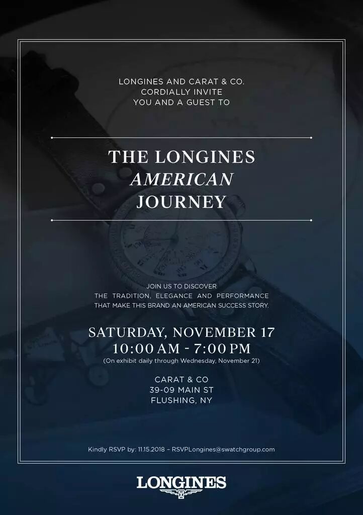 The Longines American Journey travelling museum will make its debut in Flushing at Carat & Co. this weekend. We invite you to come discover the tradition, elegance, and performance of these historic Longines pieces as a part of American history. The travelling exhibition will feature pieces flown in from the Longines Museum in Saint-Imier, Switzerland. The exhibit will run from Saturday, November 17 through the 20th.